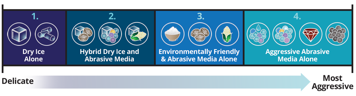 We have four levels of blasting types to fit your needs: dry ice alone, hybrid dry ice and abrasive media, environmentally-friendly and abrasive media alone and aggressive abrasive media alone. You won’t find anyone else in our industry who can offer you this scope of blasting solutions.